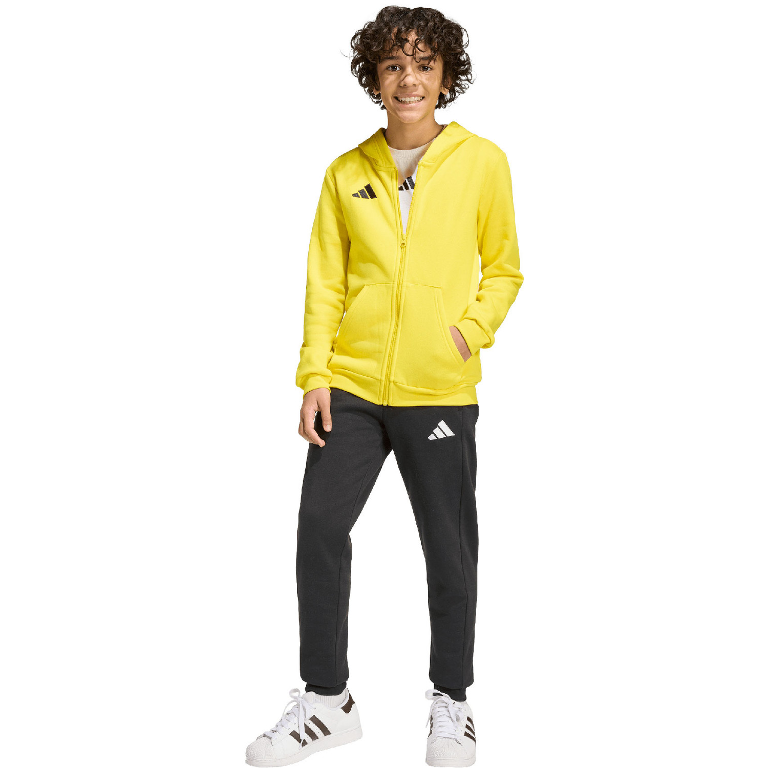 Die adidas Entrada 26 Full-Zip Kapuzenjacke Kinder bietet jungen Sportlern eine ideale Mischung aus Funktionalität und Stil. Diese Jacke aus der Entrada-Linie ist mit einem praktischen Reißverschluss und einer bequemen Kapuze ausgestattet, perfekt als zusätzliche Wärmeschicht beim Sport oder Entspannen. In einem auffälligen Gelb gehalten, ist dieses Kleidungsstück stets ein frisches Highlight in jeder Sportgarderobe.